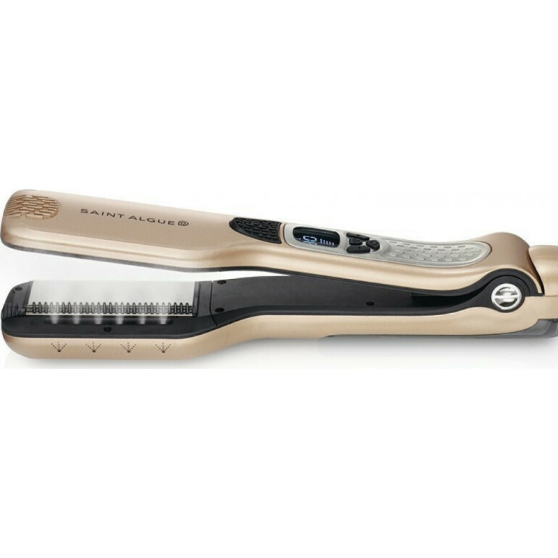 Πρέσα ατμού της Saint Algue με πλάκες από επικάλυψη τιτανίου και προαιρετική λειτουργία ατμού. Διαθέτει πολύ μεγάλο δοχείο νερού (40ml) το οποίο επιτρέπει συνεχή διάχυση ατμού για πάνω από 25 λεπτά, διαθέτει επίσης ισχυρούς διαχυτές ατμού (5g /min) για ένα ομαλό και εξαιρετικά μεταξένιο αποτέλεσμα.