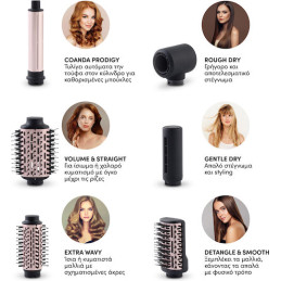 Κάθε εξάρτημα μπορεί να προσαρμοστεί στη βάση της συσκευής, δίνοντας τη δυνατότητα να αλλάζεις εύκολα στυλ — από ίσια μαλλιά έως μπούκλες ή όγκο — χωρίς να χρειάζεσαι πολλές διαφορετικές συσκευές.