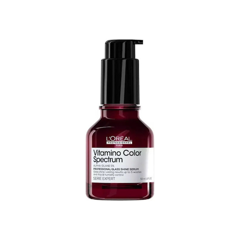 Vitamino Color Spectrum Επαγγελματικό Glass Shine Serum από τη L'Oréal Professionnel, εμπλουτισμένο με 5% Άλφα-Σιλάνη. Μαλλιά με γυάλινη λάμψη. Εμπλουτισμένο χωρίς προσθήκη νερού, η Άλφα-Σιλάνη είναι ένα ενεργό συστατικό περιποίησης που δημιουργεί ένα προστατευτικό στρώμα στο εσωτερικό της τρίχας όταν ενεργοποιείται από τη θερμότητα.