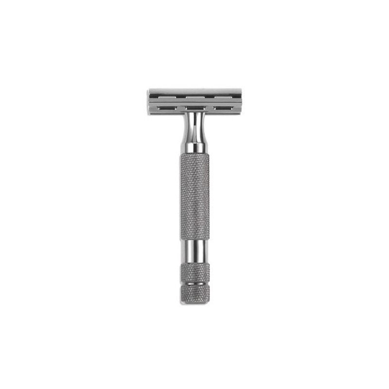 Ξυράφι ασφαλείας με κλείσιμο με πεταλούδα. vintage σχέδιο, εφαρμόζει τέλεια στο χέρι χάρη στο μεγάλο βάρος του. Χρησιμοποιείται με διπλές λεπίδες για παραδοσιακό ξύρισμα.
